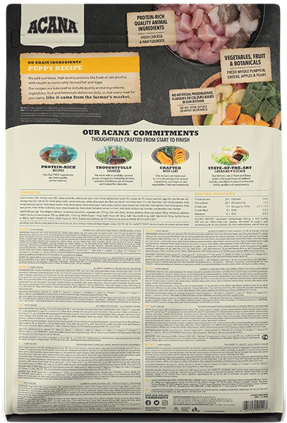 Рецептура приготована з якісних м'ясних інгредієнтів і збалансована фруктами та травами, які доставляються на кухні компанії Champion Petfoods щодня. Кожна порція корму АКАНА Паппі Ресіпе забезпечує ваше щеня харчуванням, таким, яким би воно прибувало до вас на кухню з фермерських ринків.