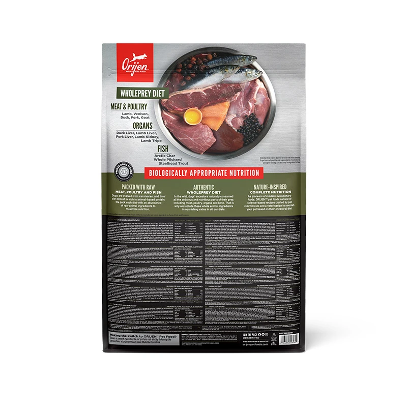 ОРІДЖЕН Тундра виготовлений з найбільш поживних і соковитих частин здобичі, представлених м'язовим м'ясом, високопоживними органами та їстівними кістками в співвідношенні WholePrey, забезпечуючи собакам харчування, в якому вони потребують.