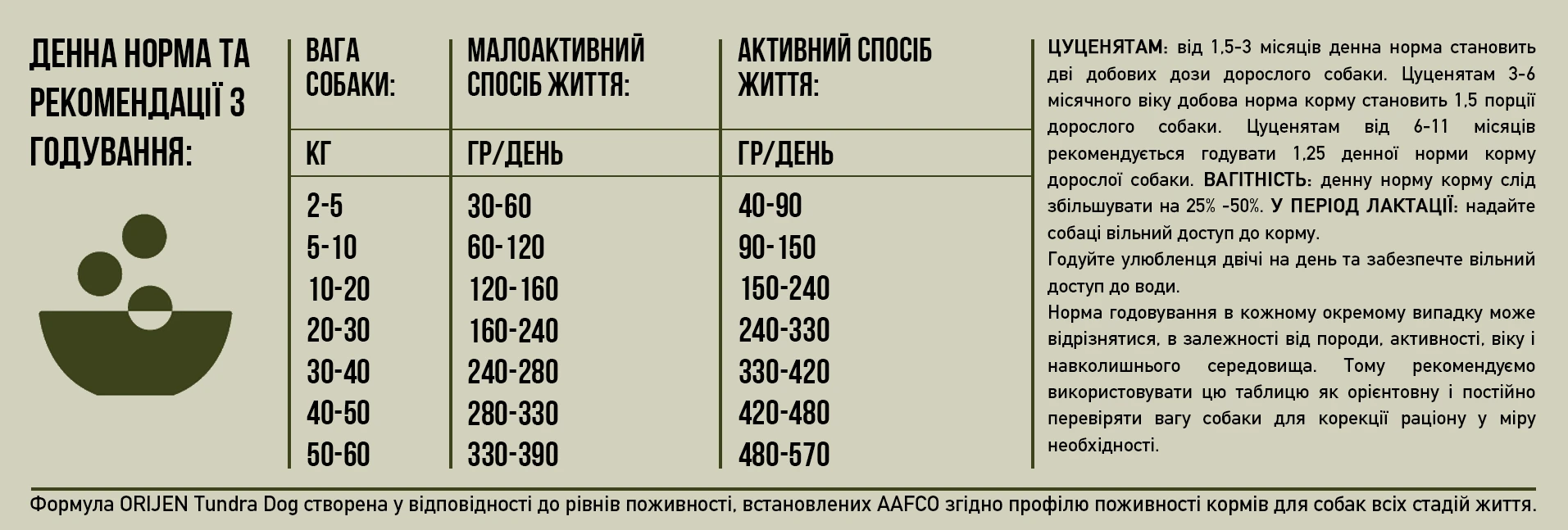 Зоотехнічні добавки: 4b1707 Enterococcus faecium NCIMB 10415 1x10^9 КОЕ. Обмінна енергія 3860 ккал/кг (463 ккал/в вимірному стакані 120 г). Де калорії розподілені наступним чином: 41% з протеїну, 17% з вуглеводів і 42% з жиру. ORIJEN Tundra Dog створений відповідно до рівнів поживності, встановленими FEDIAF для собак всіх стадій життя, за винятком собак великих порід у період росту.