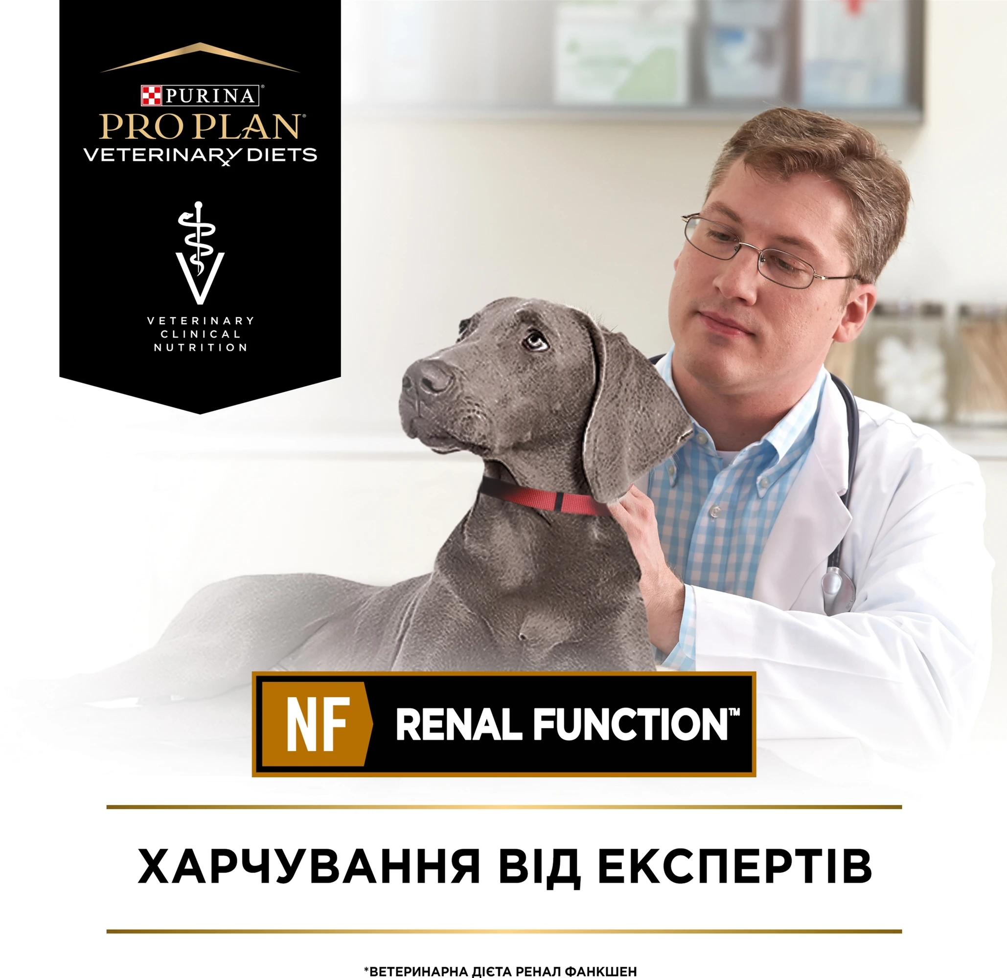 Pro Plan Veterinary Diets NF Renal Function Canine (Про план Ветеринарна дієта НФ Ренал функція) – сухий повнораціонний дієтичний корм для дорослих собак, для підтримки функції нирок при хронічній хворобі нирок. Корм рекомендований для підтримки функції нирок при хронічній нирковій недостатності, з обмеженим вмістом високоякісного білка та фосфору. Цей дієтичний раціон також застосовується для зниження утворення уратних і цистинових каменів, з низьким рівнем пуринів, помірним рівнем сірковмісних амінокислот і властивістю підщелачування сечі.