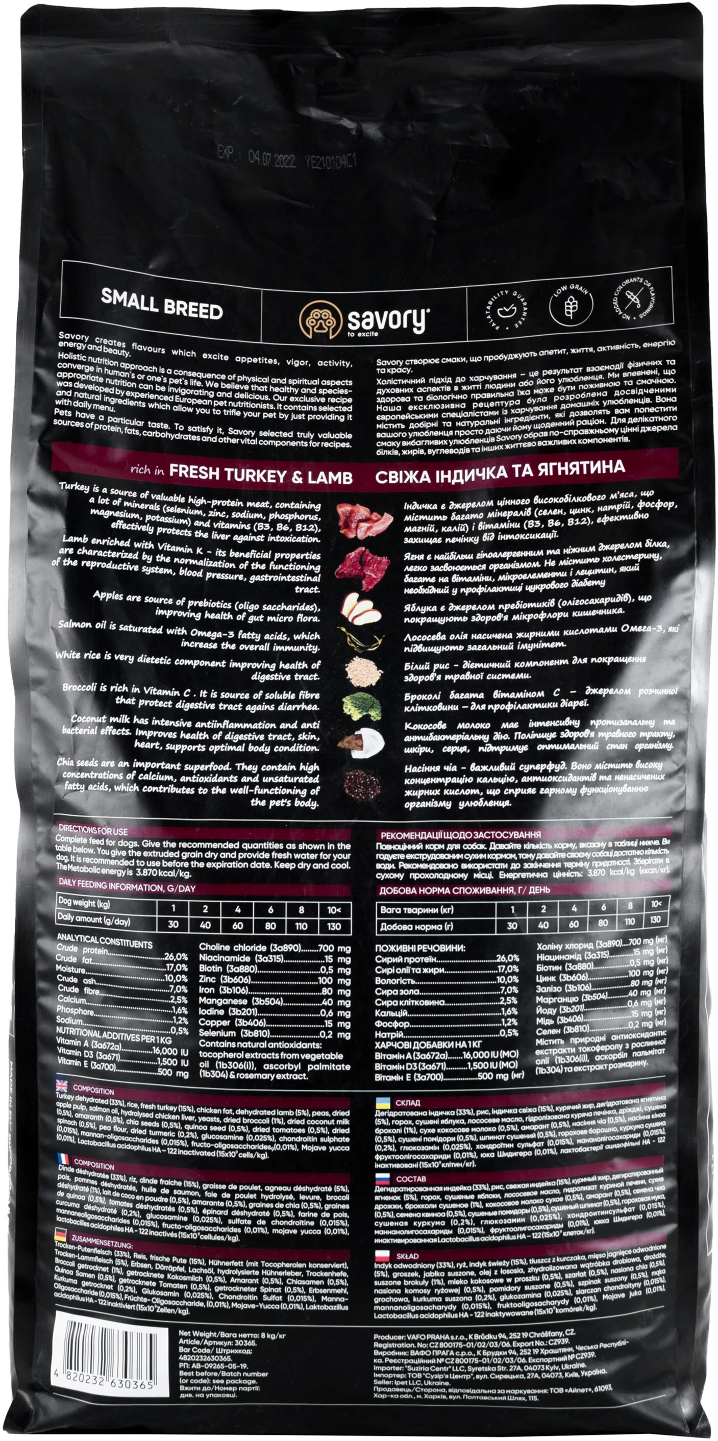 Сухий корм для собак малих порід Savory містить 53% якісного м'яса індички та ягнятини, суперфуди, яблука, броколі, шпинат. Ці компоненти створені природою для невеликого, але дуже активного песика. Гранули корму розроблені з урахуванням анатомічних особливостей собак малих порід.