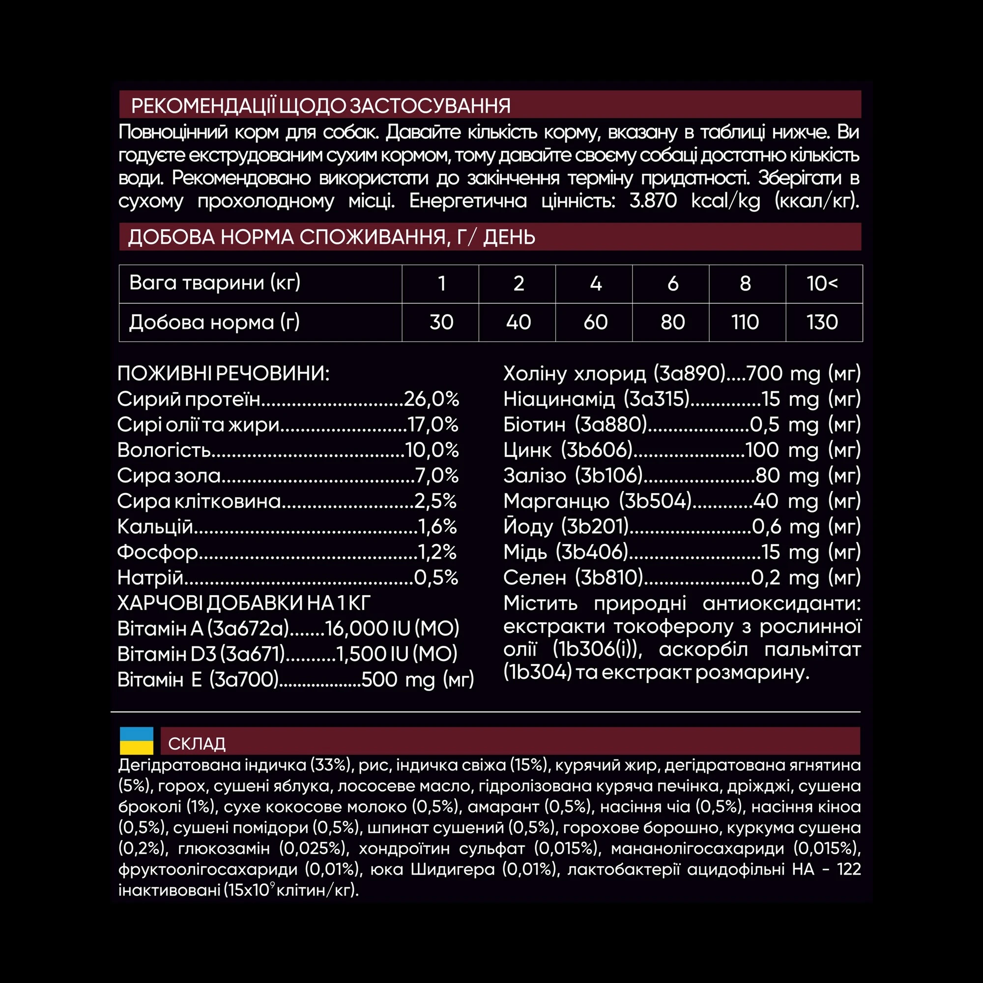 Поживні речовини: сирий протеїн 26.0%, сирі олії та жири 17.0%, вологість 10.0%, сирий попіл 7.0%, сирий клітковина 2.5%.