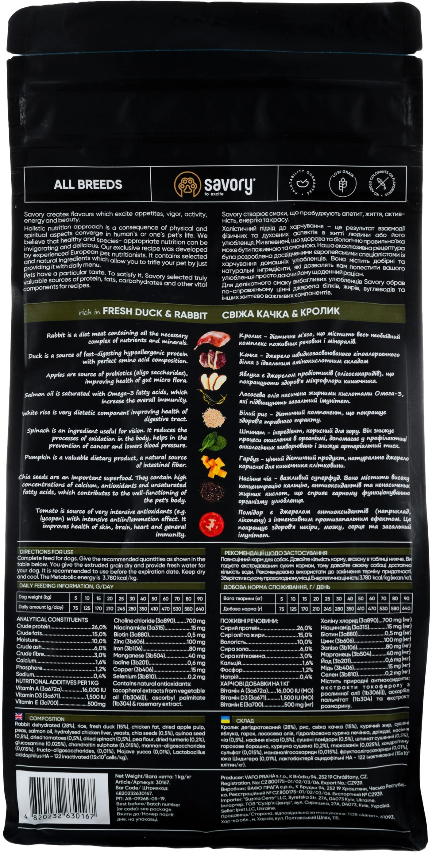 Сухий корм для собак усіх порід Savory містить якісне м'ясо качки та кролика, суперфуди, яблука, гарбуз та куркуму. Ці компоненти створені природою для оптимальної кондиції, здорових суглобів та розкішного вигляду собаки.
