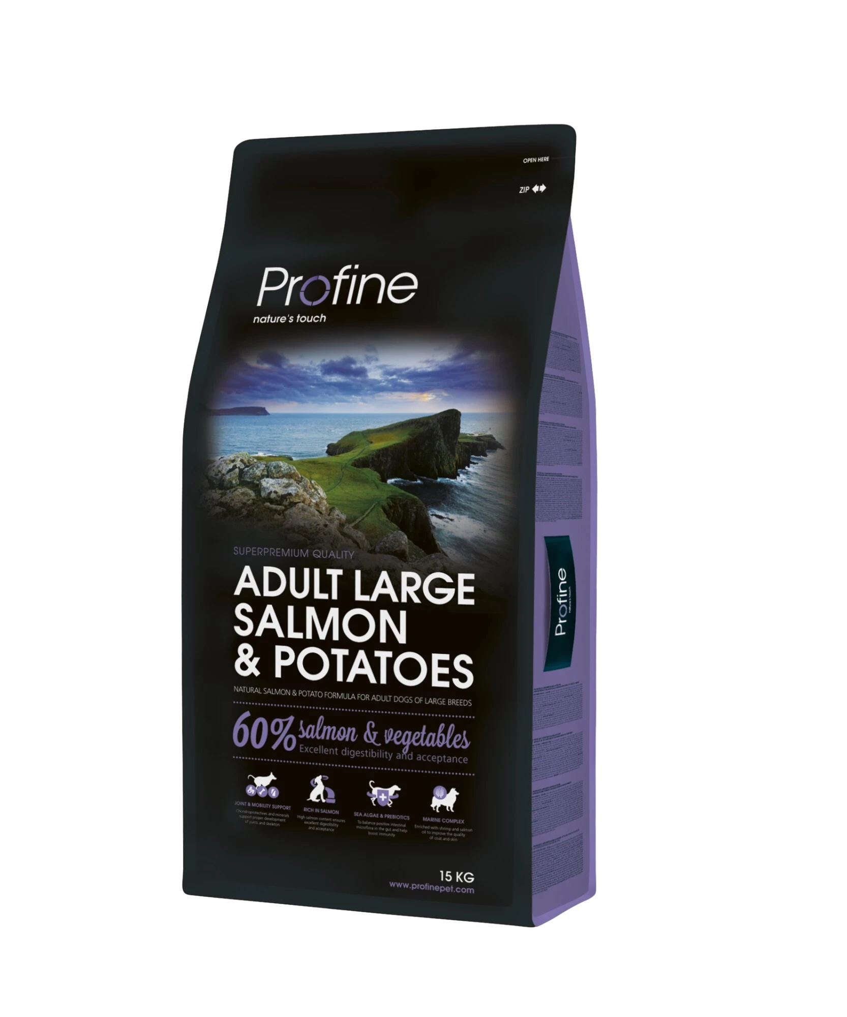 Profine Dog Adult Large Breed Salmon & Potatoes Повнораціонний сухий корм з лососем і картоплею для дорослих собак великих і гігантських порід, схильних до появи алергії та харчової непереносимості.