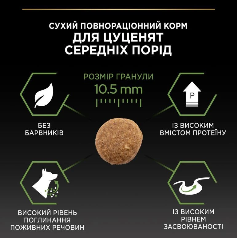 Перший рік життя вашої собаки (або два роки, якщо ваш щеня великої породи) є вирішальним для його здоров'я на протязі всього життя. У цей період ваш щеня потребує особливого харчування, щоб у нього сформувалися міцні зуби, м'язи та кістки. А оскільки природний захист його організму ще не повністю сформувався, щеня ще не може бути надійно захищеним. Цей період у житті собаки також називають «імунним пробілом», коли існує високий ризик ураження інфекціями та порушеннями травної системи. Щоб допомогти щенятам отримати найкращий старт у житті, ветеринари та дієтологи Purina розробили корм для щенят середніх порід PRO PLAN PUPPY.