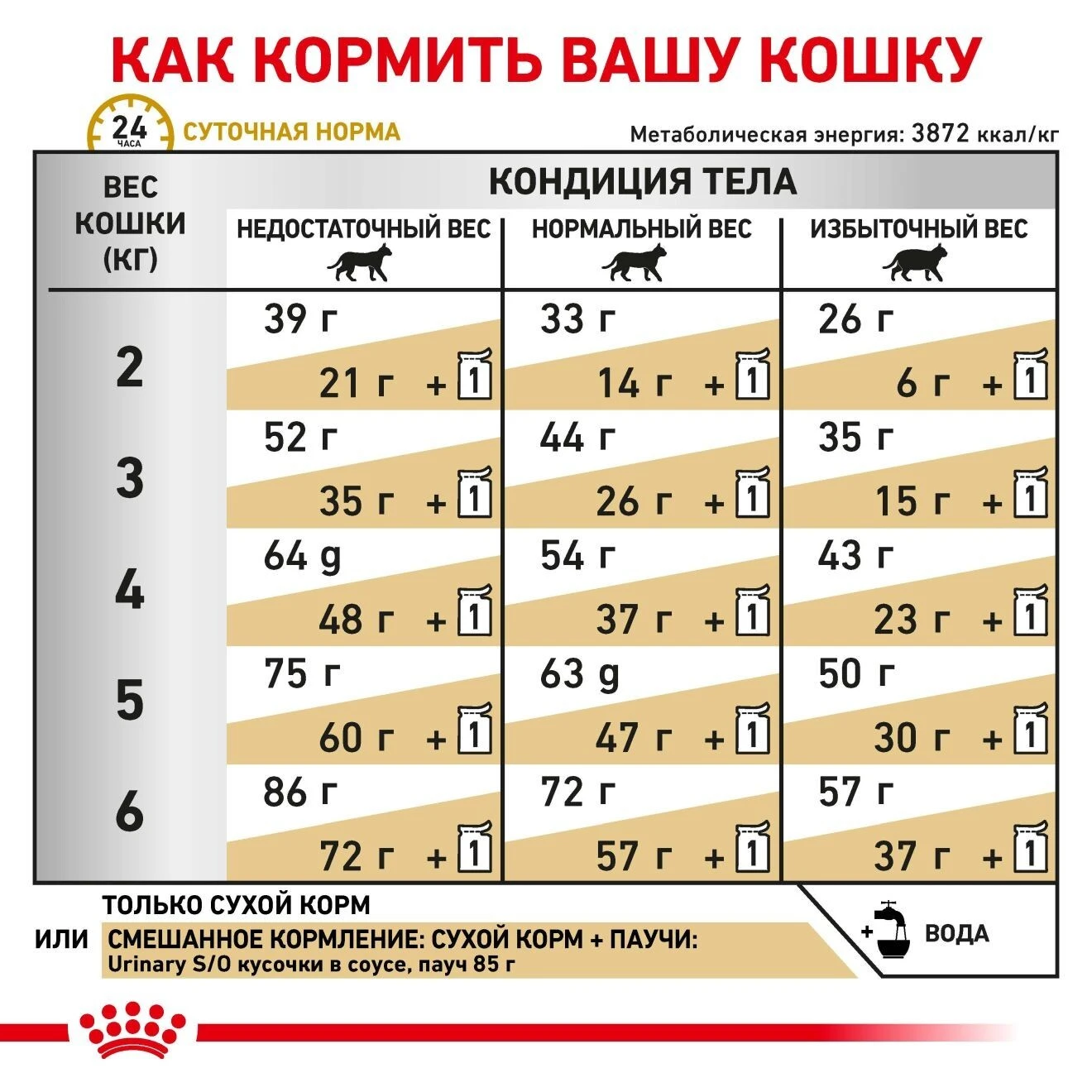 сирий протеїн – 34,5%; сирий жир – 15%; сира зола – 8,9%; сира клітковина – 2,9%; кальцій – 0,9%; фосфор -0,9%; натрій – 1,3%; хлориди – 2,26%; калій – 1%; магній – 0,05%; сірка – 0,7%, загальний таурин – 0,23%; EPA та DHA - 0,37%. Речовини, що підкислюють сечу: сульфат кальцію (1,25 %), DL-метіонін (0,39 %).