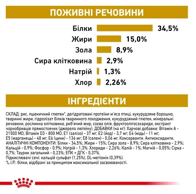 Рис, пшеничний глютен *, дегідратоване м'ясо птиці, кукурудзяна мука, тваринні жири, кукурудзяний глютен, гідролізат тваринних білків, мінеральні речовини, рослинна клітковина, риб'ячий жир, соєва олія, фруктоолігосахаріди (ФОС), гідролізат панцира ракоподібних (джерело глюкозаміна), екстракт чорнобривців прямостоячих ( джерело лютеїну).