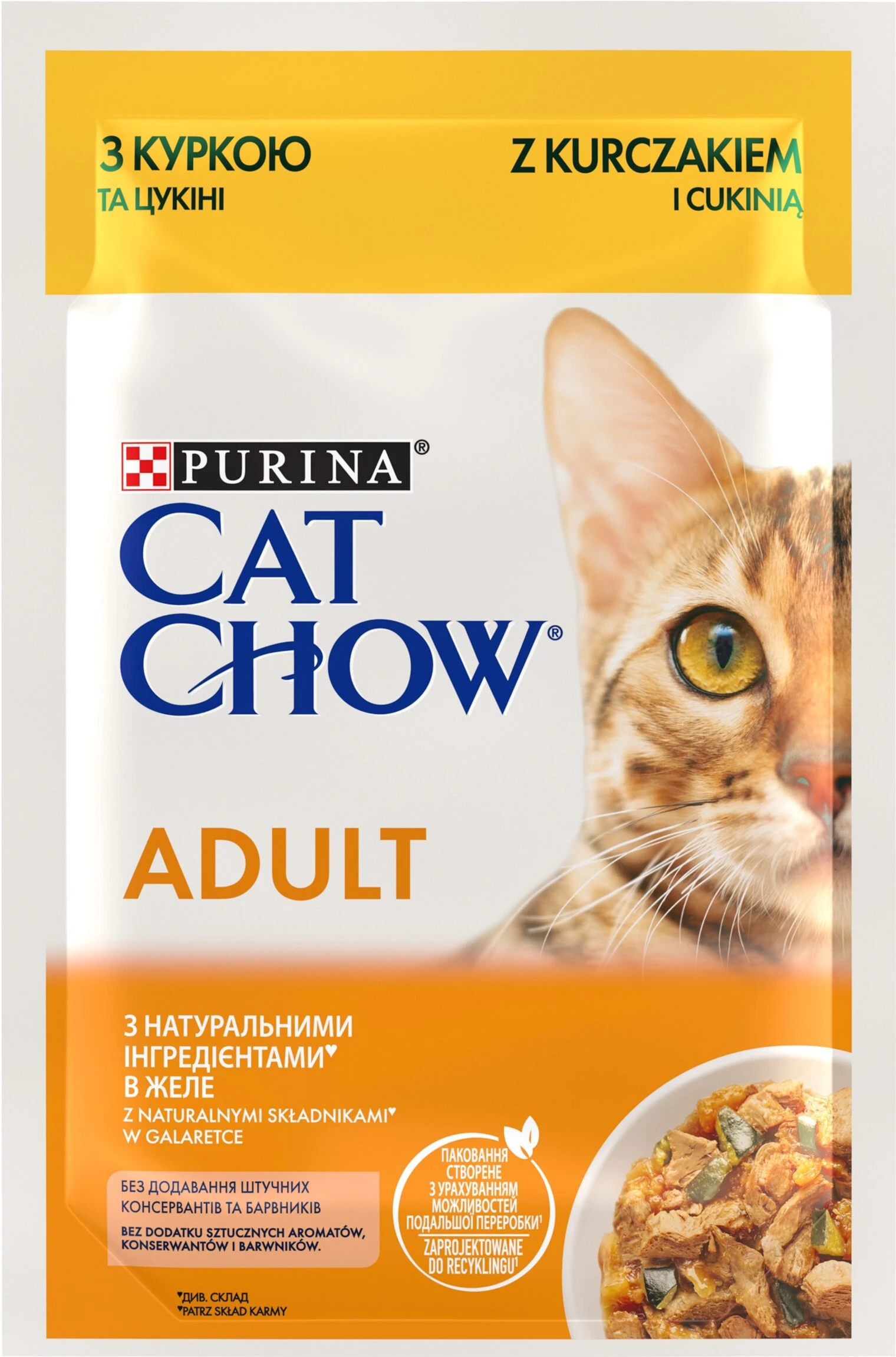 Purina CAT CHOW (Кет Чау). З куркою та цукіні. Ніжні шматочки в желе. Консервований порційний повнораціонний корм для дорослих котів.