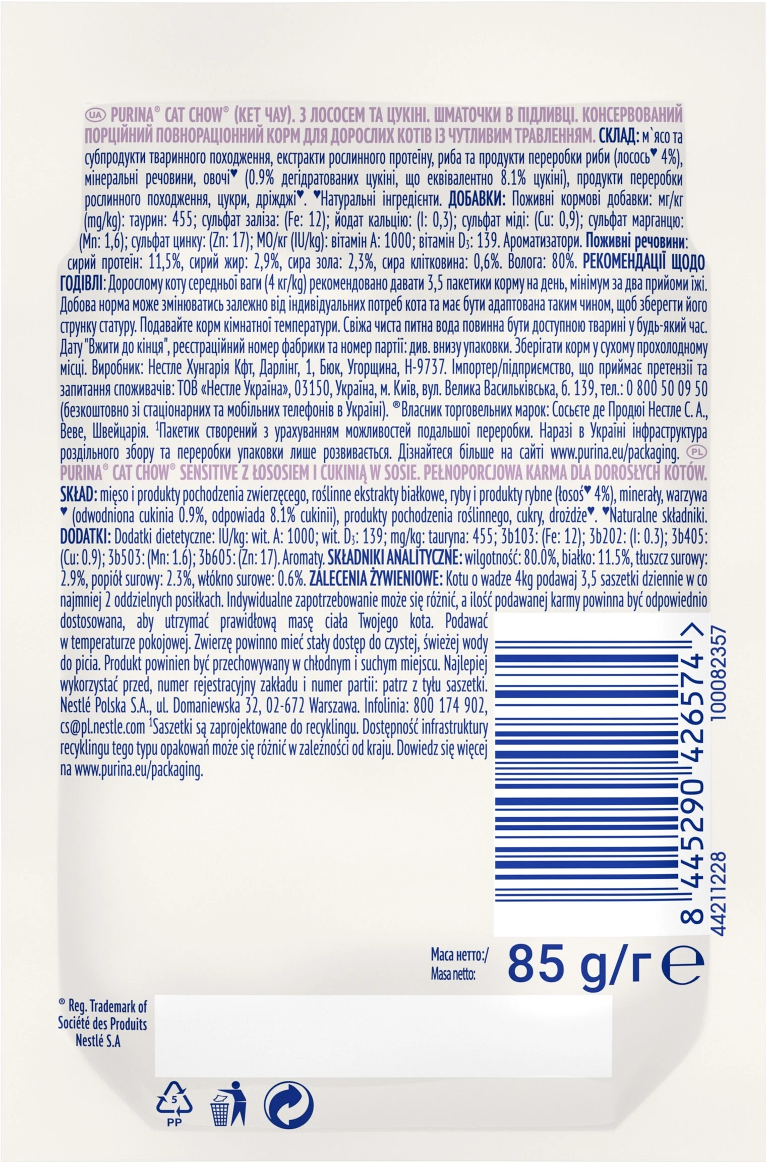 Purina CAT CHOW (Кет Чау). З лососем і цукіні. Шматочки в соусі. Консервований порційний повнораціонний корм для дорослих котів з чутливою травною системою.