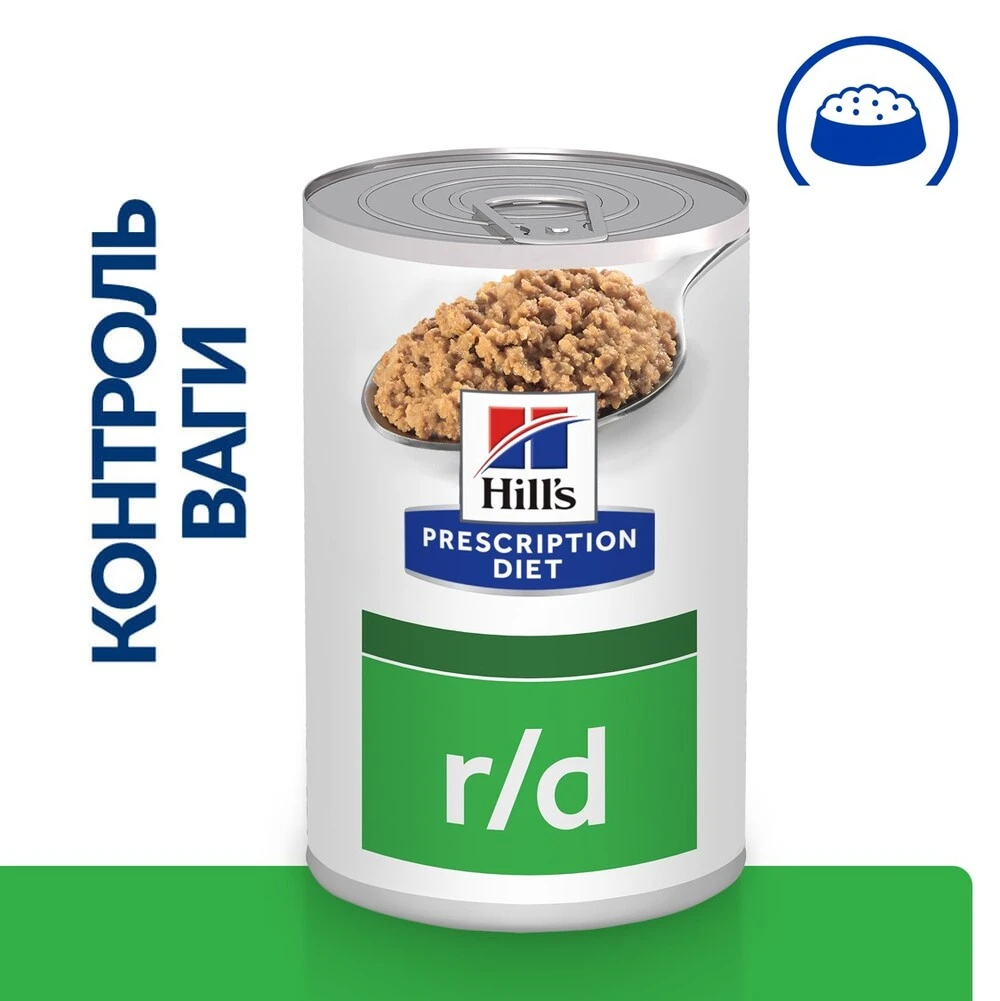 Вологий корм для собак Hill's PRESCRIPTION DIET r/d – повнораціонне дієтичне харчування для собак Hill's PRESCRIPTION DIET r/d спеціально розроблене дієтологами та ветеринарними лікарями, щоб допомогти тварині позбутися зайвої ваги.