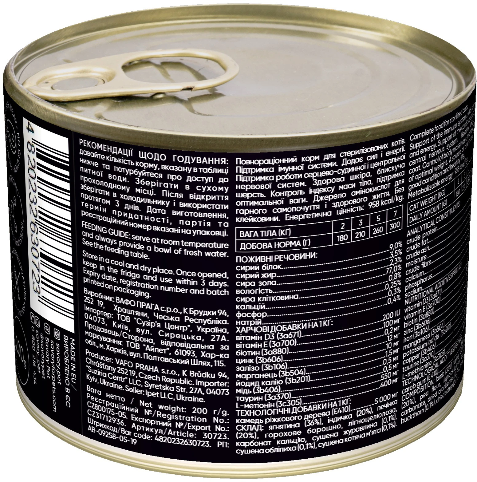 Повнораціонний вологий корм з ягняти для стерилізованих котів.